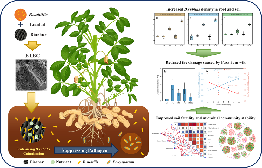 花生作为全球重要的油料与饲用作物,其连作种植导致的养分失衡和土传病害频发,而传统化学防治手段易引发环境残留和病原菌抗药性。研究团队将高效生防抑病菌枯草芽孢杆菌(Bacillus subtilis)负载于秸秆生物炭,构建出稳定的微生物-生物炭复合制剂(BTBC)。研究结果表明生物炭的多孔结构可为枯草芽孢杆菌提供物理庇护,可有效增强菌株在土壤中的定殖存活能力。生物炭负载芽孢杆菌的应用通过增强土壤生态系统的抗干扰能力,富集Gemmatimonas、Mortierella抑病类群等机制协同抑制了尖孢镰刀菌在土壤环境及花生根部中的侵染与定殖。这一技术有助于解决传统微生物菌剂环境适应性差、定殖效率低的瓶颈,为生物炭负载微生物的田间应用提供了理论支撑和实践范式。