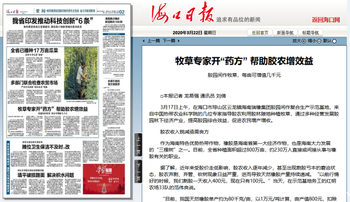 本报记者 龙易强 通讯员 刘倩 3月17日上午,在海口市琼山区云龙镇海南瑞橡集团胶园间作复合生产示范基地,来自中国热带农业科学院的几位专家指导胶农利用胶林隙地种植牧草,通过多种经营发展胶园林下经济产业,提高胶园综合效益,促进农民增产增收。