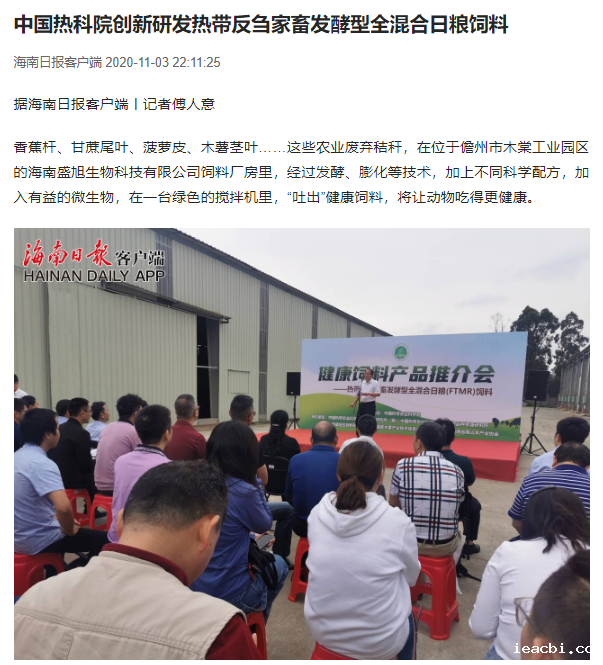 11月3日,中国热带农业科学院在此举行热带反刍家畜发酵型全混合日粮饲料发布会,由中国热科院畜牧研究团队与海南盛旭生物科技有限公司、海南省黑山羊产业协会等单位进行合作,将热带反刍家畜发酵型全混合日粮饲料产品推向市场。