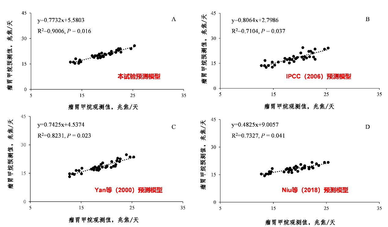 该研究采用六氟化硫示踪技术,系统研究了我国主要奶牛品种-荷斯坦奶牛在泌乳前期、泌乳中期以及泌乳后期的瘤胃甲烷排放规律;结合动物生长试验和消化代谢试验,研究了不同饲粮结构条件下的变化特征。基于饲料营养成分和摄入量、产奶量以及能量摄入量等5种指标建立了甲烷排放预测模型,并通过将该系列模型与国外的研究结果对比分析,揭示出该研究中的预测模型具有更好的预测准确度和适用性,为系统评估规模化奶牛场碳排放和研发减排调控措施提供了科学支撑。