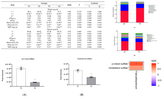 混合微生态制剂的研究结果表明,在育肥期文昌鸡饲粮中添加0.2%-0.6%的富含粪肠球菌、枯草杆菌、嗜酸乳杆菌、产气假丝酵母等微生物的混合微生态制剂,可显著降低了文昌鸡胸肌和腿肌的剪切力。添加0.6%的混合微生态制剂组文昌鸡胸肌中的总不饱和脂肪酸、单不饱和脂肪酸含量及不饱和脂肪酸/饱和脂肪酸显著增加,其肠道内容物中含有较高的Lactobacillus,并且Bacteroides, Rikenellaceae RC9 gut group, Olsenella, Prevotellaceae UCG-001 和 Prevotella含量显著降低。关联分析结果表明,0.6%的混合微生态制剂组和对照组文昌鸡肠道中共有17个差异代谢物与7个差异属菌群显著相关。