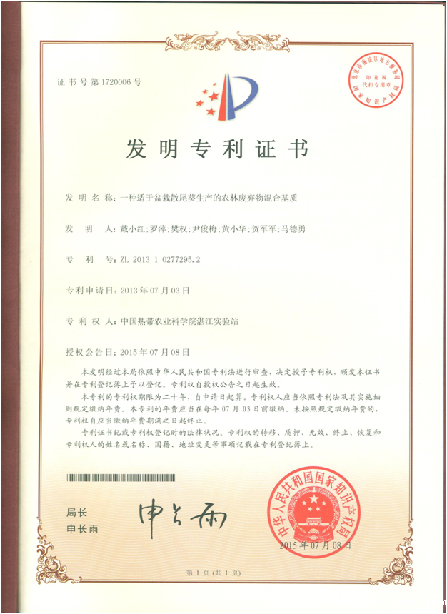 发明专利 — “一种适于盆栽散尾葵生产的农林废弃物混合基质”